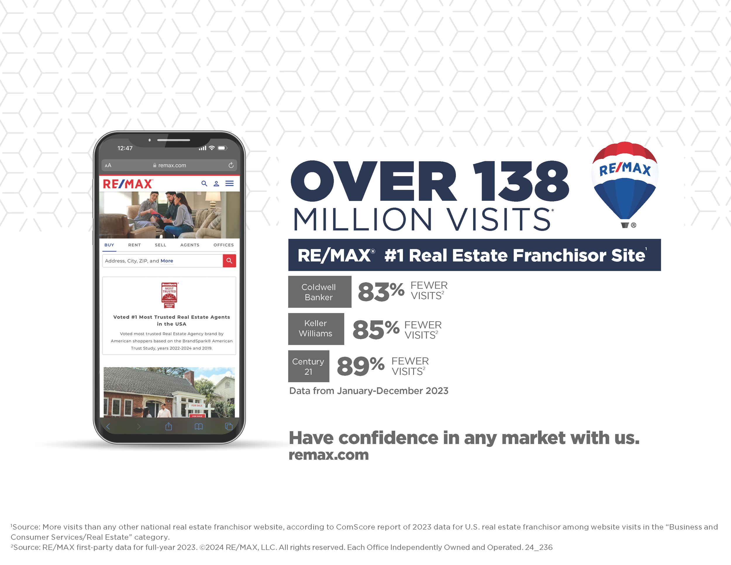Real estate clichés? We've seen them all. But trust isn't about what you see — it's about what we do. That's why RE/MAX agents have been voted the most trusted* in real estate. *Voted most trusted Real Estate Agency brand by American shoppers based on the BrandSpark® American Trust Study, years 2022-2024, and 2019.